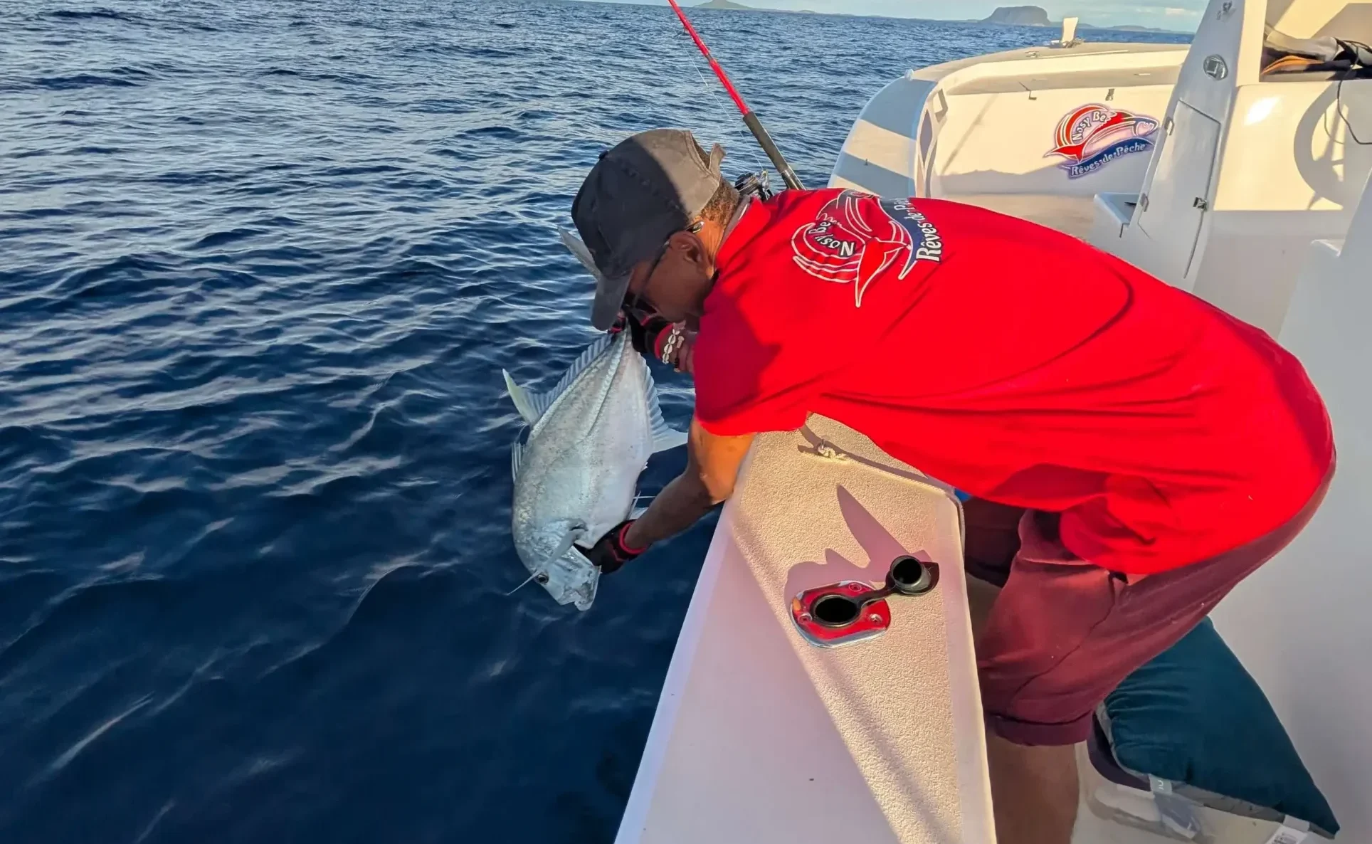 Relâcher d’une carangue gros-yeux (Caranx sexfasciatus) dans le respect de la pêche sportive raisonnée.
